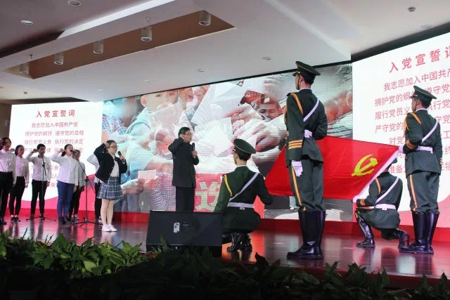 全体与会师生党员代表起立,怀揣着崇高的敬意庄严宣誓。“永不叛党”的声声回响,洪亮的宣誓声是我们对党最诚挚的承诺,在继往开来的新时代我们必将继续发挥党员的先锋模范作用,不忘初心,砥砺前行。