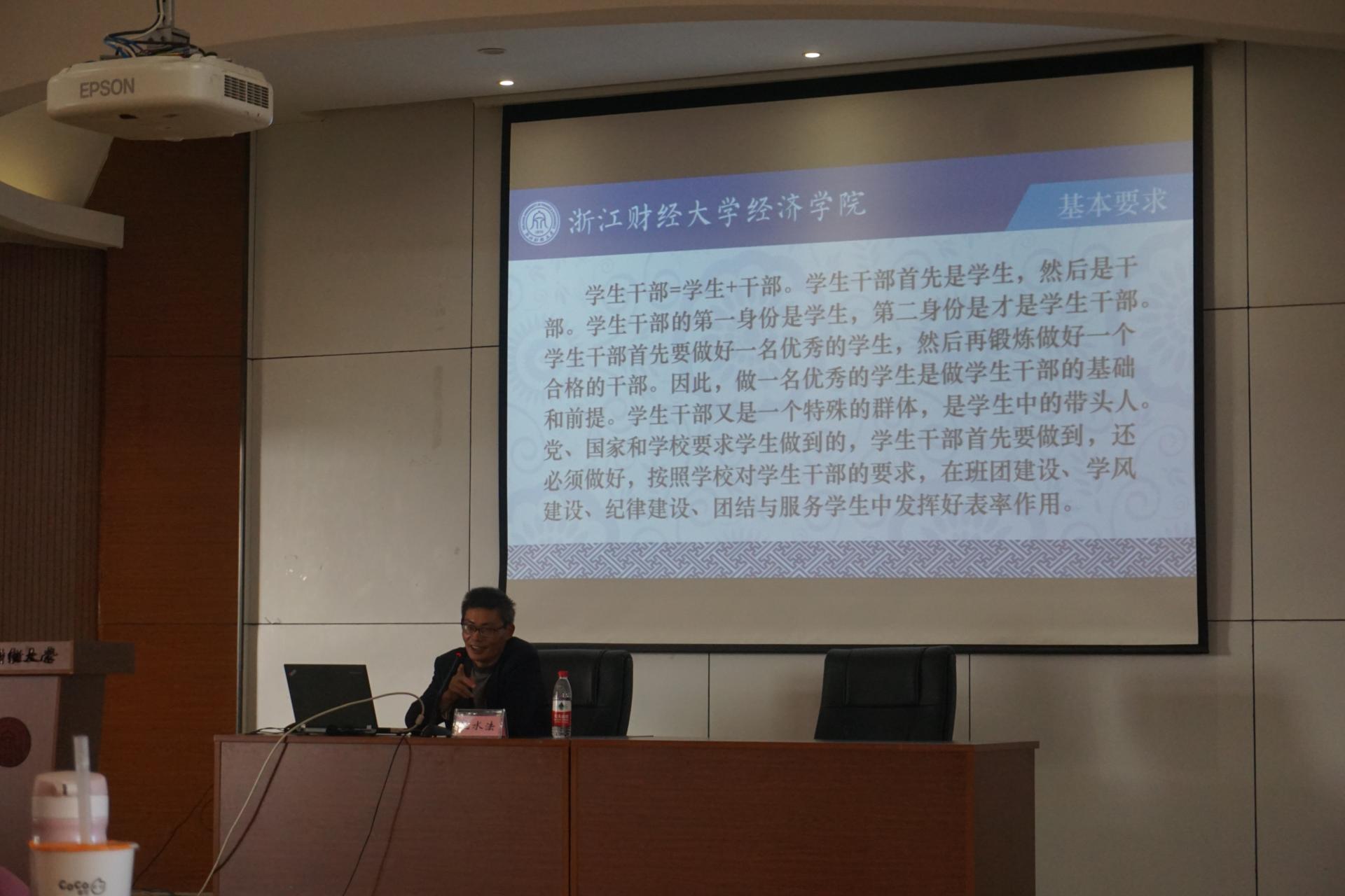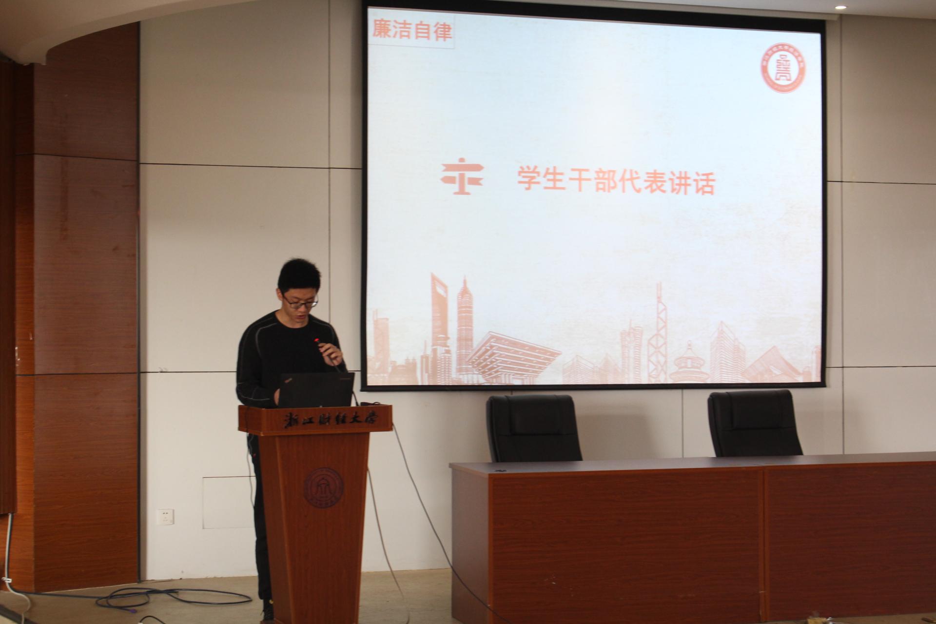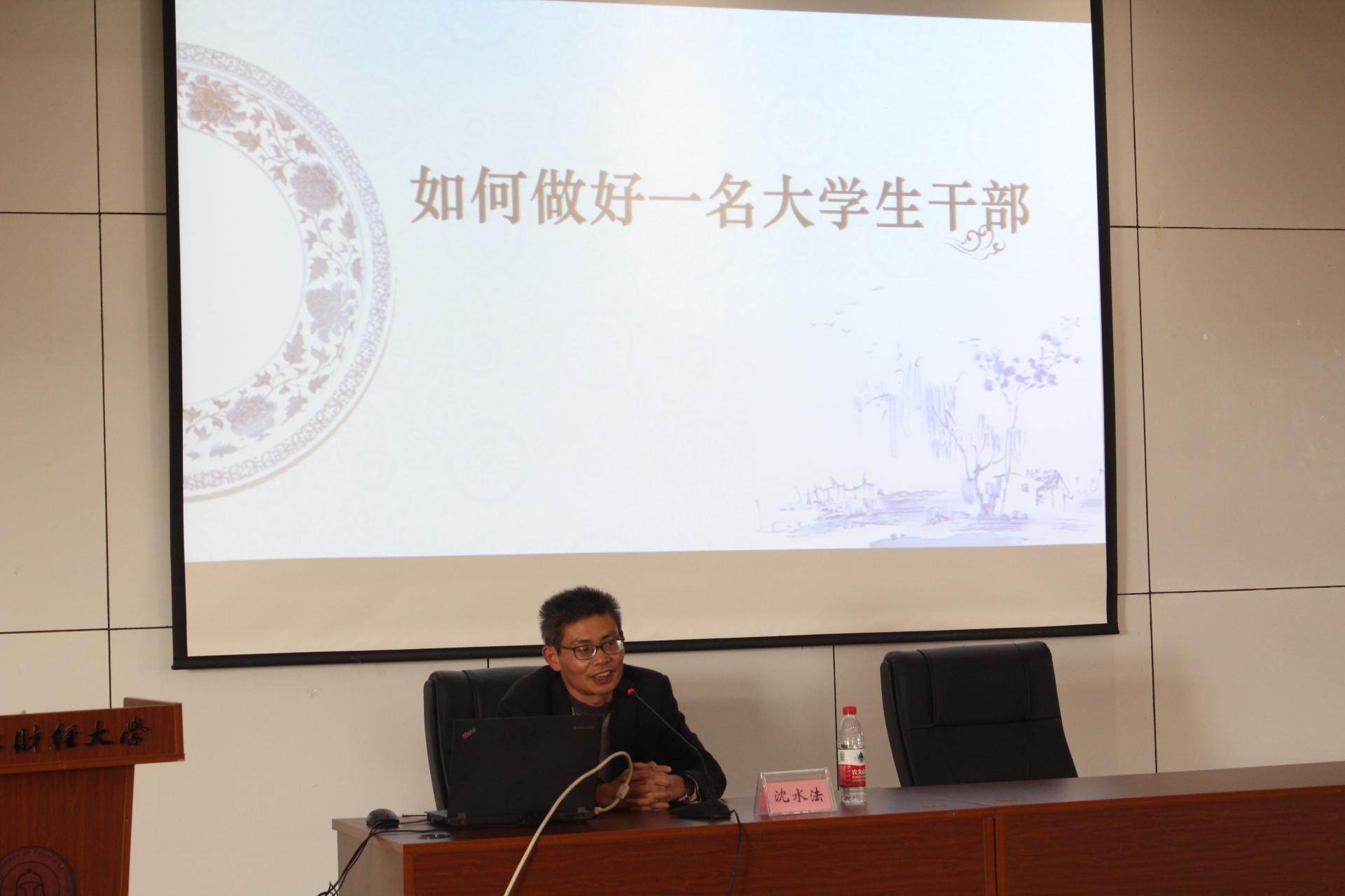 学院党委书记沈水法从如何做好一名大学生干部对学生干部进行廉洁教育。他认为学生干部先是学生后是干部,做一名优秀的学生是做好学生干部的基础和前提。学生干部是学生中的带头人,党、国家和学校要求学生做的,学生干部首先要做到,还必须做好,在学业、班团建设、学风建设、纪律建设、团结与服务学生中严格要求自己,发挥好表率作用。