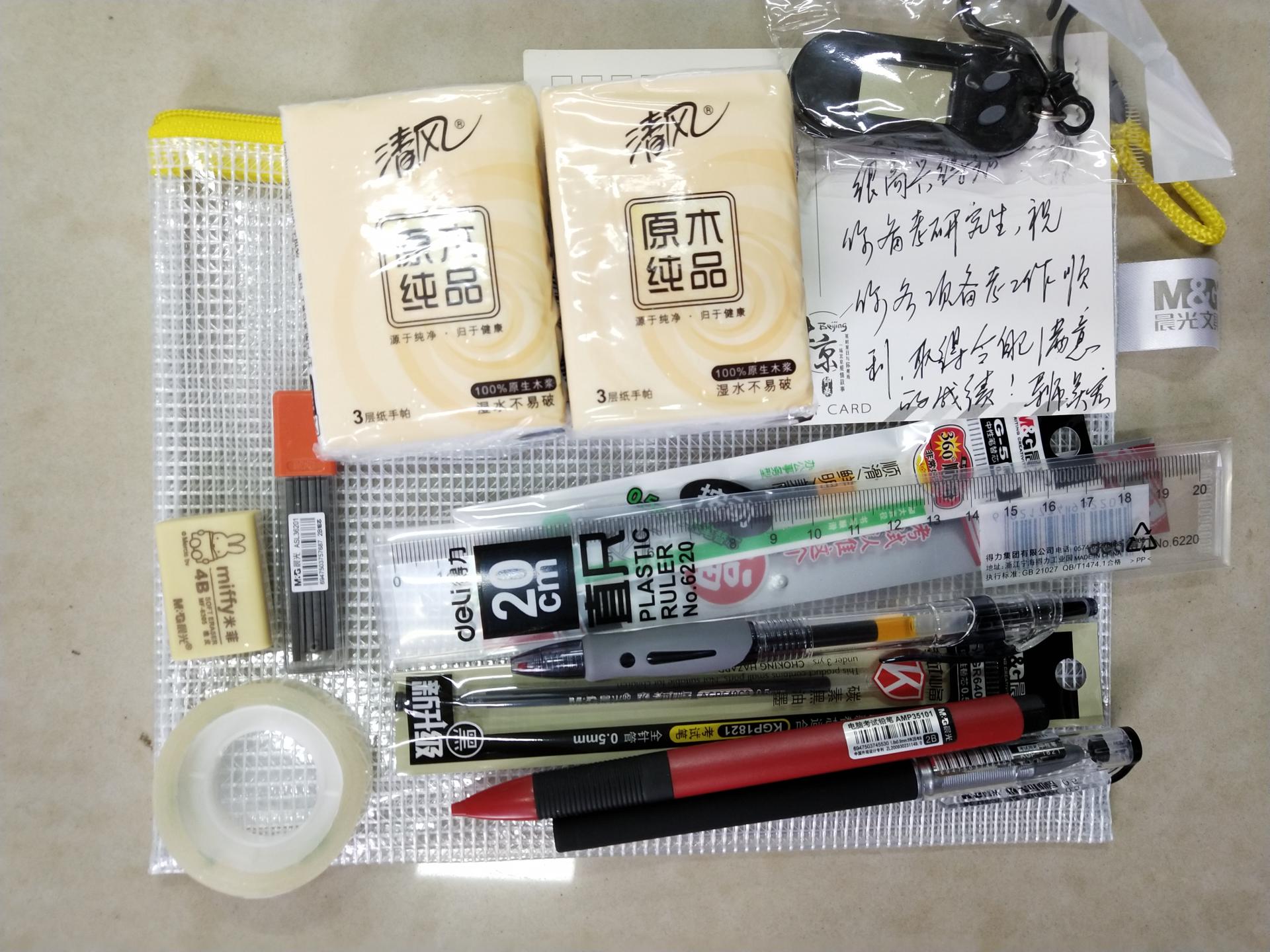 随后,沈水法书记与杨小恩副书记为每位考研学子送上学院里精心准备的“考研加油包”。“考研加油包”中有学生们考试专用的各样文具:黑色签字笔、可替换笔芯、2B自动铅笔、2B铅笔芯、橡皮、直尺、修正胶卷、面巾纸、计算器。值得一提的是,加油包中还有一份特殊的礼物——来自各位导师亲自写下的寄语明信片。