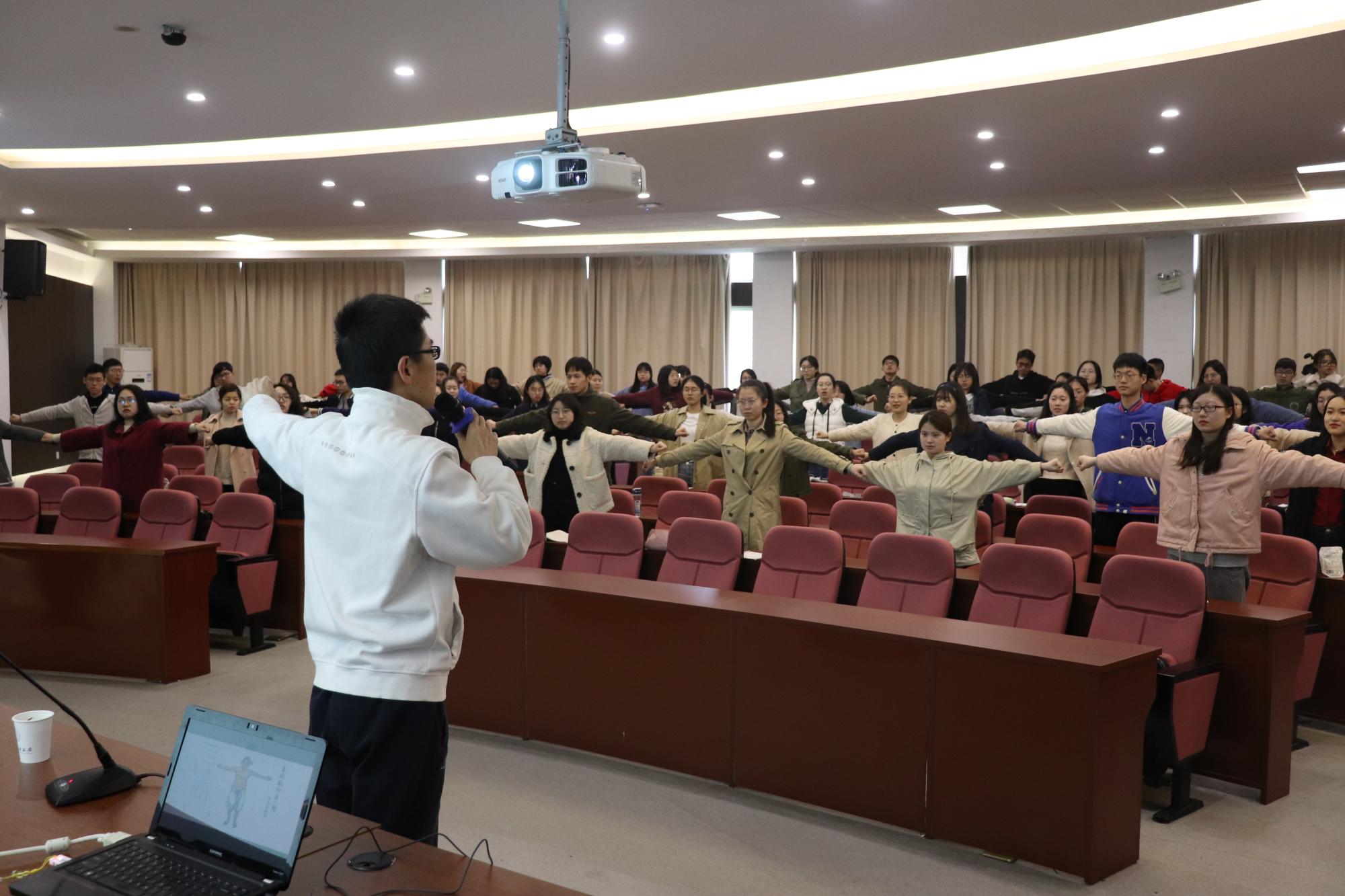 细雨微低,乍暖还寒之际,赵宏利博士在学涯湖畔开始了他精彩的讲授。他从我们的生活之处入手,结合习近平总书记对传统中医药文化的高瞻远瞩“中医药学是开启中华文明宝库的钥匙”,深度剖析“健康”一词,打破了我们对传统身体健康的认知,深刻地认识到保持身体康健最主要的手段是防病,而不是病后治愈。赵宏利老师结合传统中医理论,对比印度瑜伽,在讲座中亲自演示古本易筋经养生十二式,在场师生也在现场一起跟着做。他耐心指导同学们的动作,并讲解中医相关穴位的知识,让在座的广大师生切身体会这套养生操的魅力。