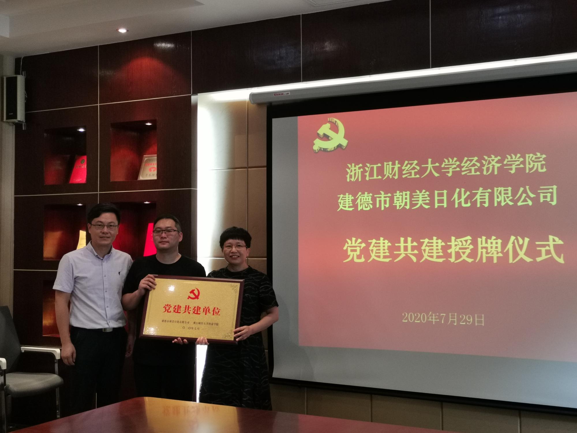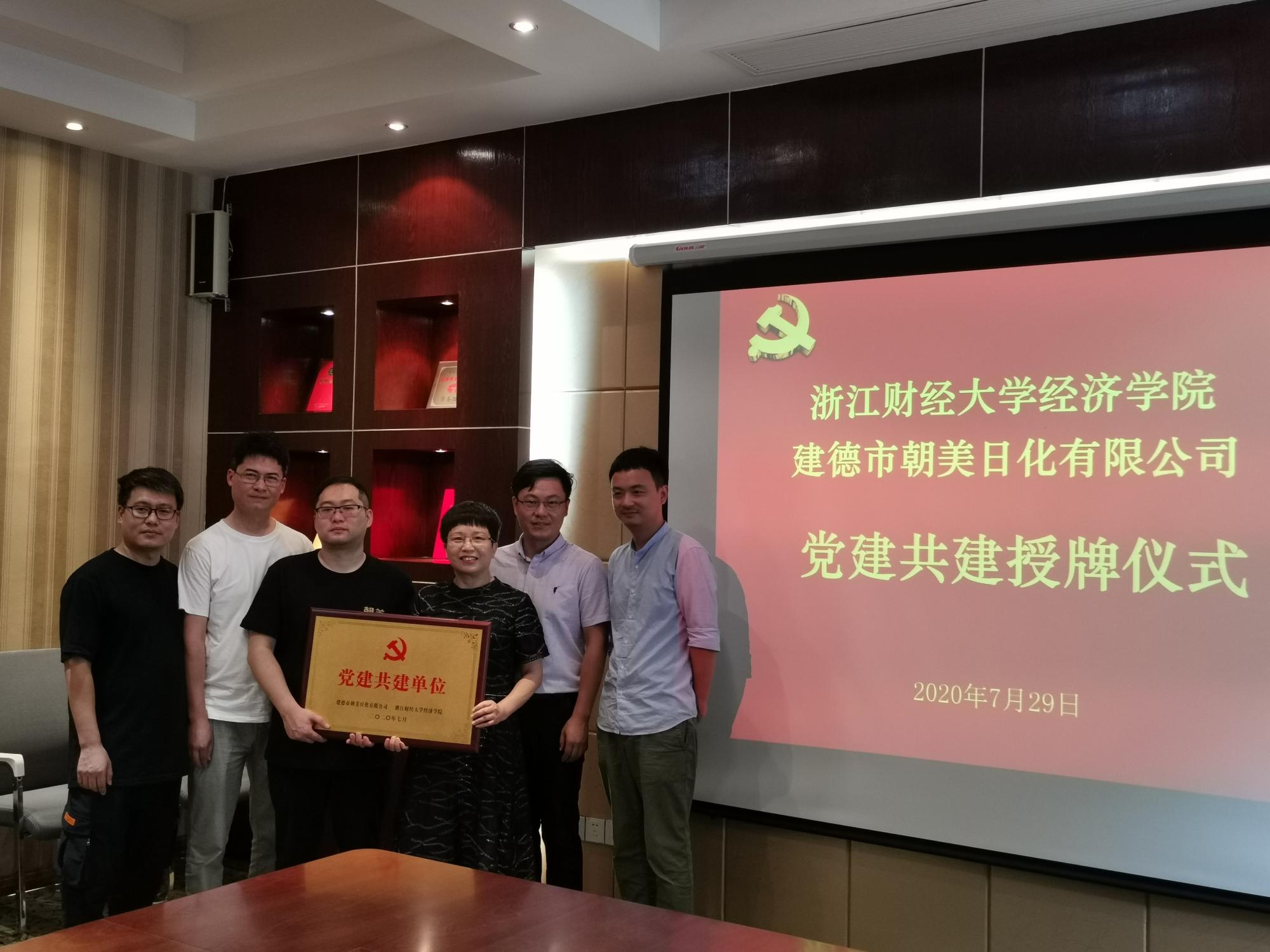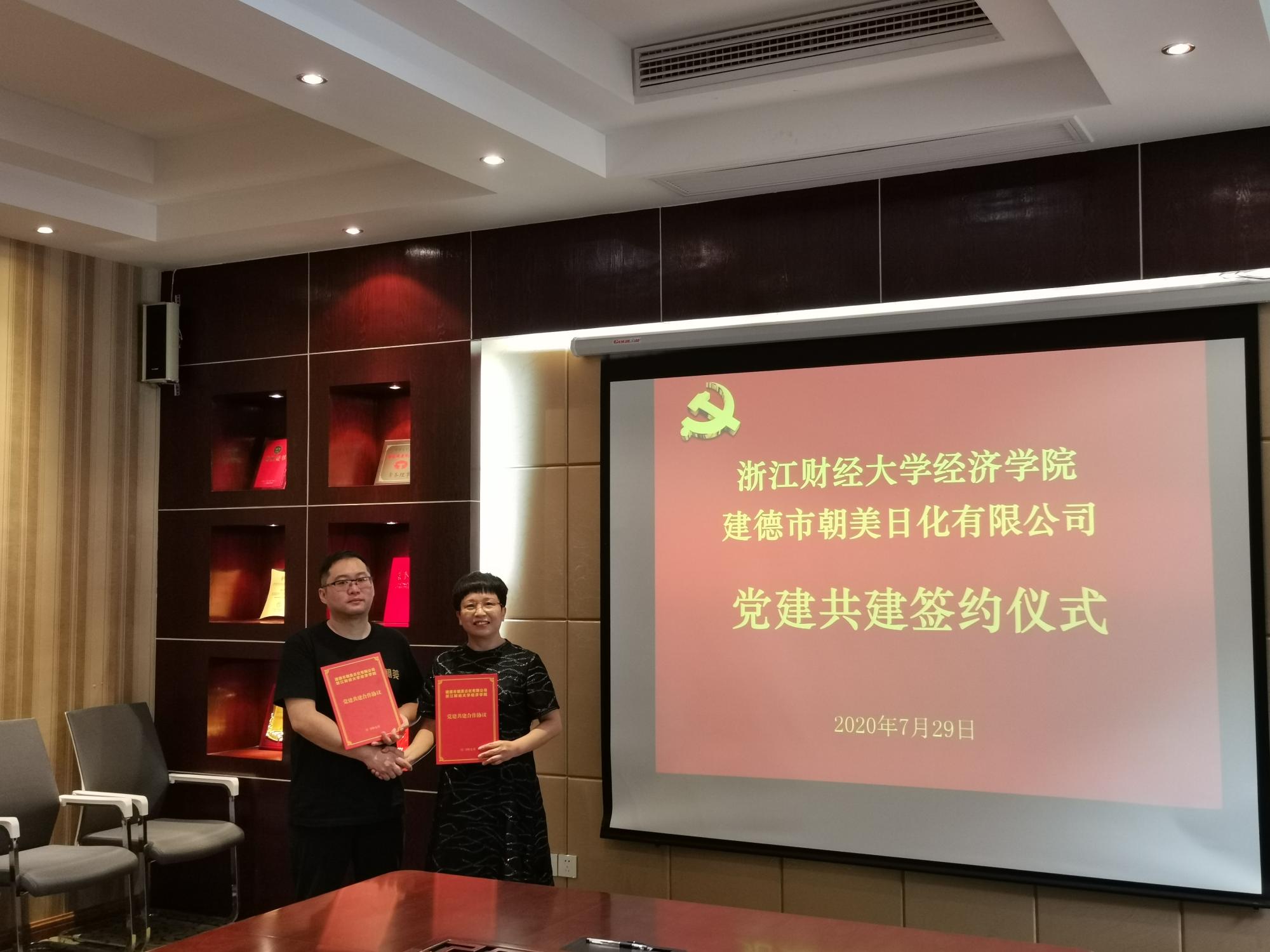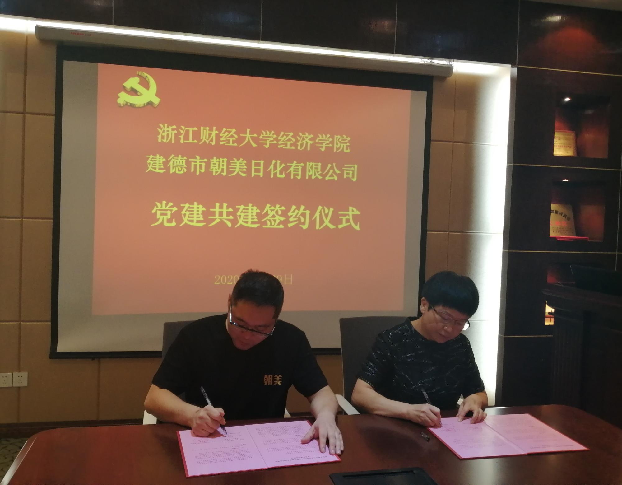 与建德市朝美日化有限公司举行党建共建签约仪式,建德市朝美日化有限公司总经理林焰伟、学院党委书记胡亦琴、院长、党委副书记王正新、党委副书记崔泰铭等出席签约仪式。