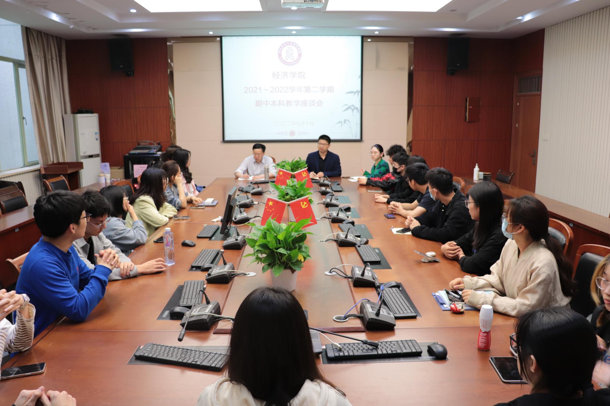 在学院楼210会议室召开了2021-2022学年第二学期本科生期中教学座谈会,教学院长邓晓军、经济系系主任邱风、教学秘书高晓菁以及各班学习委员共20余人参加了本次座谈会。