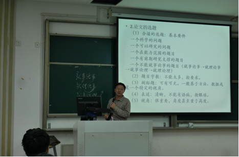 首先,邱风教授从“科研的一般路径”、“论文的选题”、“开题报告和正文撰写的主要关注点”三个部分,向同学们介绍如何撰写一篇本科毕业论文。