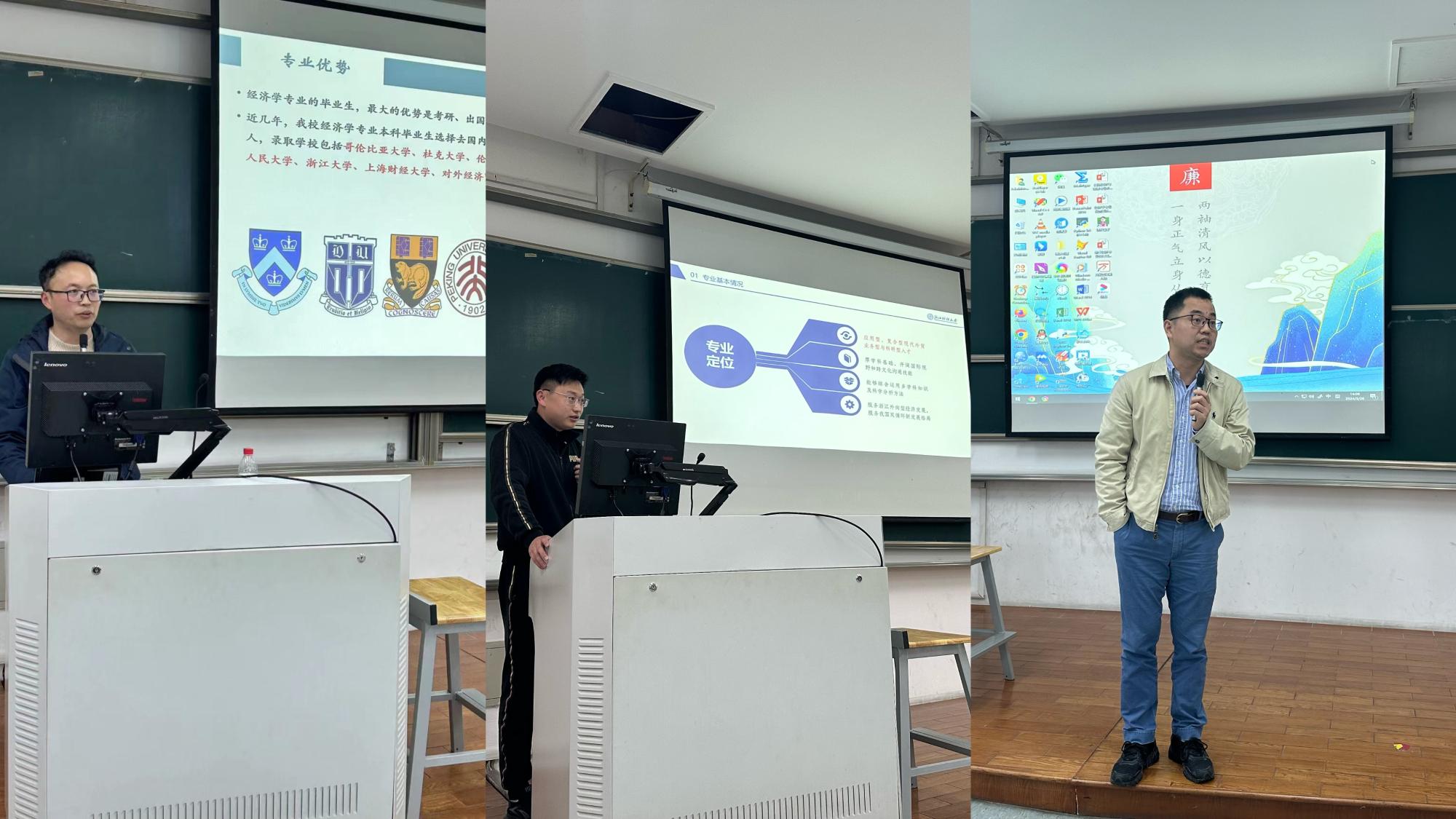 于3月26日在6号楼111教室召开2022级大类分流动员会。本次动员会邀请了经济学系主任马汴京老师、国际经济与贸易系主任冯阔老师以及数字经济系主任汪晓辉老师分别给同学们介绍三个本科专业,为大类分流提供建议和指导。