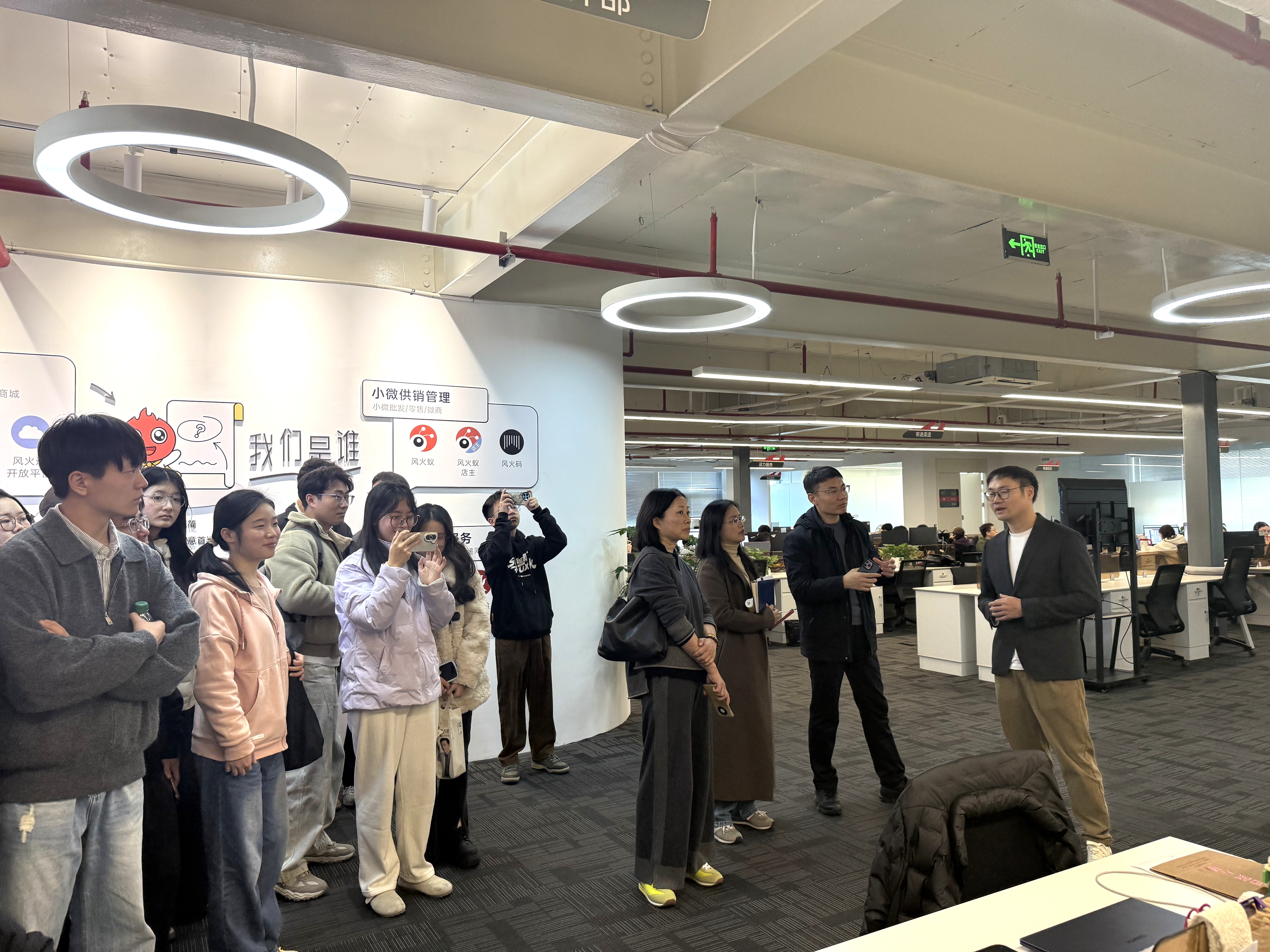 在蓝川科技展厅,师生们深入了解其核心产品“风火递”的发展历程与商业逻辑。据蓝川科技创始人兼CEO刘赳介绍,“风火递”最初以“打单工具”为起点,迅速聚集了大量小微商家用户。随着数据积累与业务延展,逐步构建起一个连接电商平台、实体商户、快递企业、快递员乃至消费者的协同服务网络,形成了覆盖快递、电商、AI服务、硬件合作等多维度的数字生态体系。