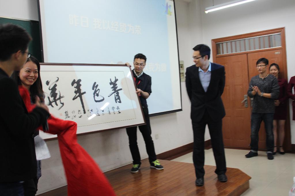 活动由梦想学员代表发言拉开序幕,随后,三位学长赠给学院和新一届经贸人“菁色年华”四个大字。作为回赠,a漫