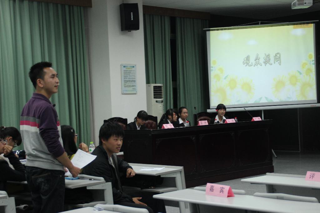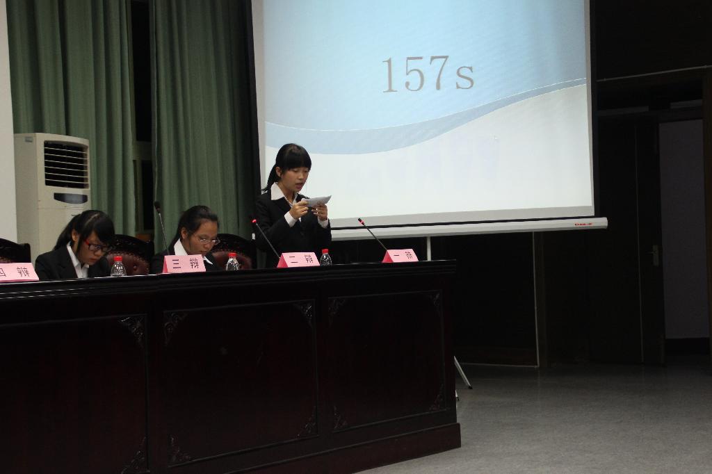本场辩论赛的主题是“中国监督权是否应该下放”。正方13国贸一班,支持中国监督权下放,13国民经济则持相反意见。在双方辩手简单的自我介绍之后,比赛正式拉开帷幕。“我方认为现阶段中国的监督权应该下放,因为……”正方一辩慷慨激昂,由政府和百姓两个层面切入,列举了中国监督权下放的必要性,精彩的陈词,带动了全场的气氛,鼓掌加油声连连。随后反方一辩的驳词也毫不示弱,从我国现行基本国情出发,层层剖析,条理清晰、证据充分,强有力地证明了己方的观点,精彩的发言同样赢得了热烈的掌声。在随后的攻辩环节,双方更是针锋相对、步步紧逼,无论哪方稍有疏忽,对手就立马抓住这个细小的漏洞进行追问,现场气氛迅速升温,达到白热化阶段。