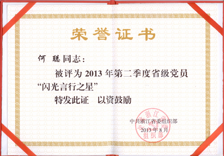 09级国贸1班何聪被评为浙江省2013年第二季度省级党员“闪光言行之星”。