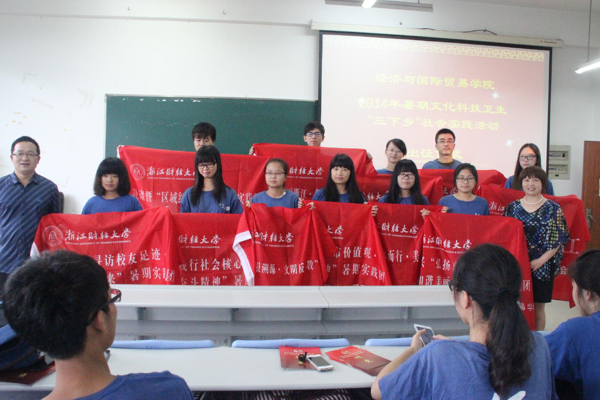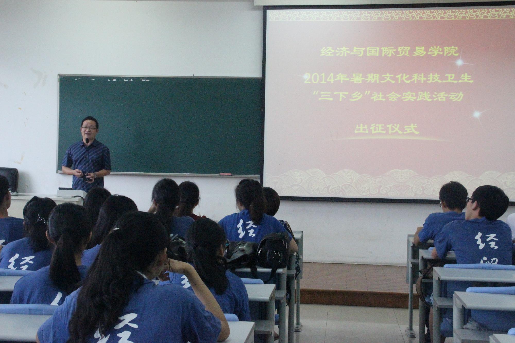 在学院楼105教室举行了“2014年暑期文化科技卫生‘三下乡’社会实践活动出征仪式”。院长胡亦琴、党总支书记范建锋、党总支副书记叶秀、带队老师及全体实践团成员出席了仪式。