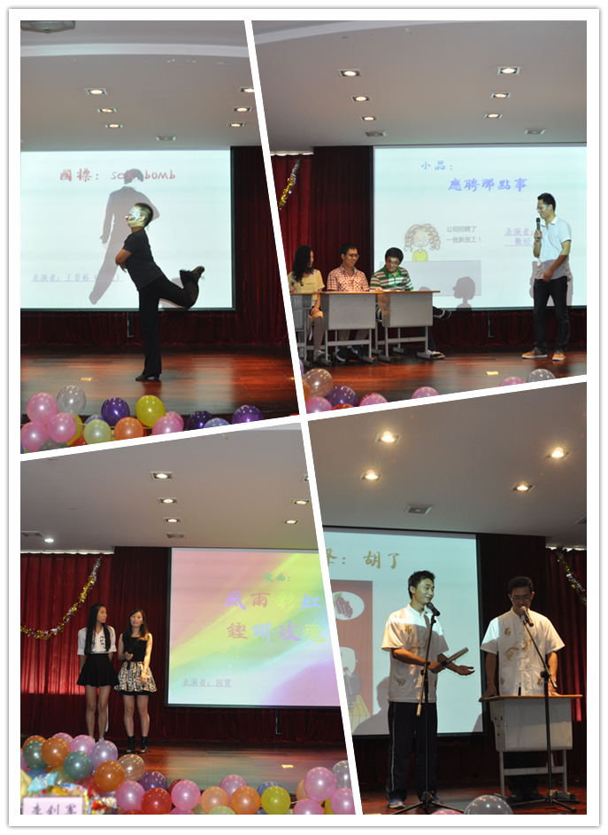 晚会在动感热情的开场舞中拉开了序幕,开场舞后,范老师热烈欢迎新同学的到来,鼓励同学们既要学的踏实也要玩的开心,勉励同学们在新学期奋勇拼搏,书写美好未来。范老师的期待点燃了同学们对未来新生活的动力,现场掌声雷动。独唱海芋恋掀起了晚会的小高潮;小品快与慢分别用快速和慢速的精彩表演,演绎了一场滑稽的笑剧;国标独舞充分展示了柔美身姿之魅力;双截棍柔中带刚,耍的有模有样;国贸女生的《风雨彩虹》,铿锵玫瑰,铮铮风骨,直击心灵。游戏、抽奖、模仿、猜词、歌曲串烧、情歌对唱、相声模仿,浮夸的百变大咖秀自由飞翔,更是将整场晚会带入到另一个高潮,夸张的造型,大胆的表演营造出震撼的“大牌明星”效应,丰富的节目展示了研究生们的才华与热情。