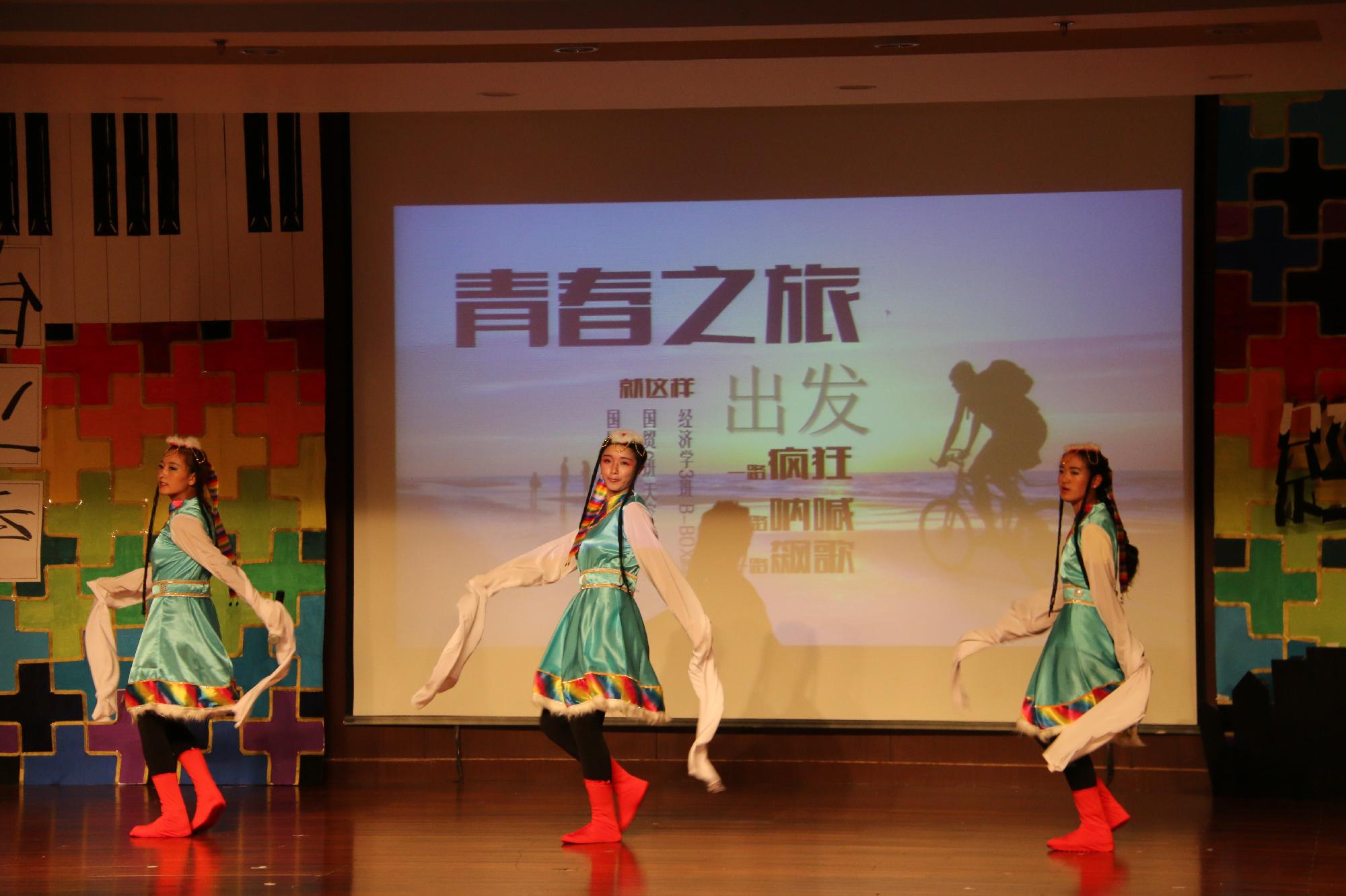 在同学们期待的眼神中,一场《青春之旅》悄然启程。悠扬的双簧管、律动的电子琴、活力四射的街舞、自由的B-BOX、载歌载舞的藏族姑娘……完美的组合,精彩的表演,现场热烈欢庆的气氛一浪高过一浪。随后,由14国3同学带来的小品《歌舞大清》以其特色与幽默掀起了晚会的小高潮,而舞蹈《乐舞光影》将现场观众带入流光溢彩、梦幻与现实交织的光影世界。班导们精心准备的创意走秀——《班导快跑》让大家见到了不一样的班导。民族舞《西域风情》又将观众带入一个神秘而美丽的民族。岁月如梦,时光如水,音乐剧《亲爱的》耐人寻味,让人在感动之余发现那些默默相守的爱。而正值财大四十周年校庆,朗诵《光影财大》讲述了校史的厚重与深远,诠释了a漫