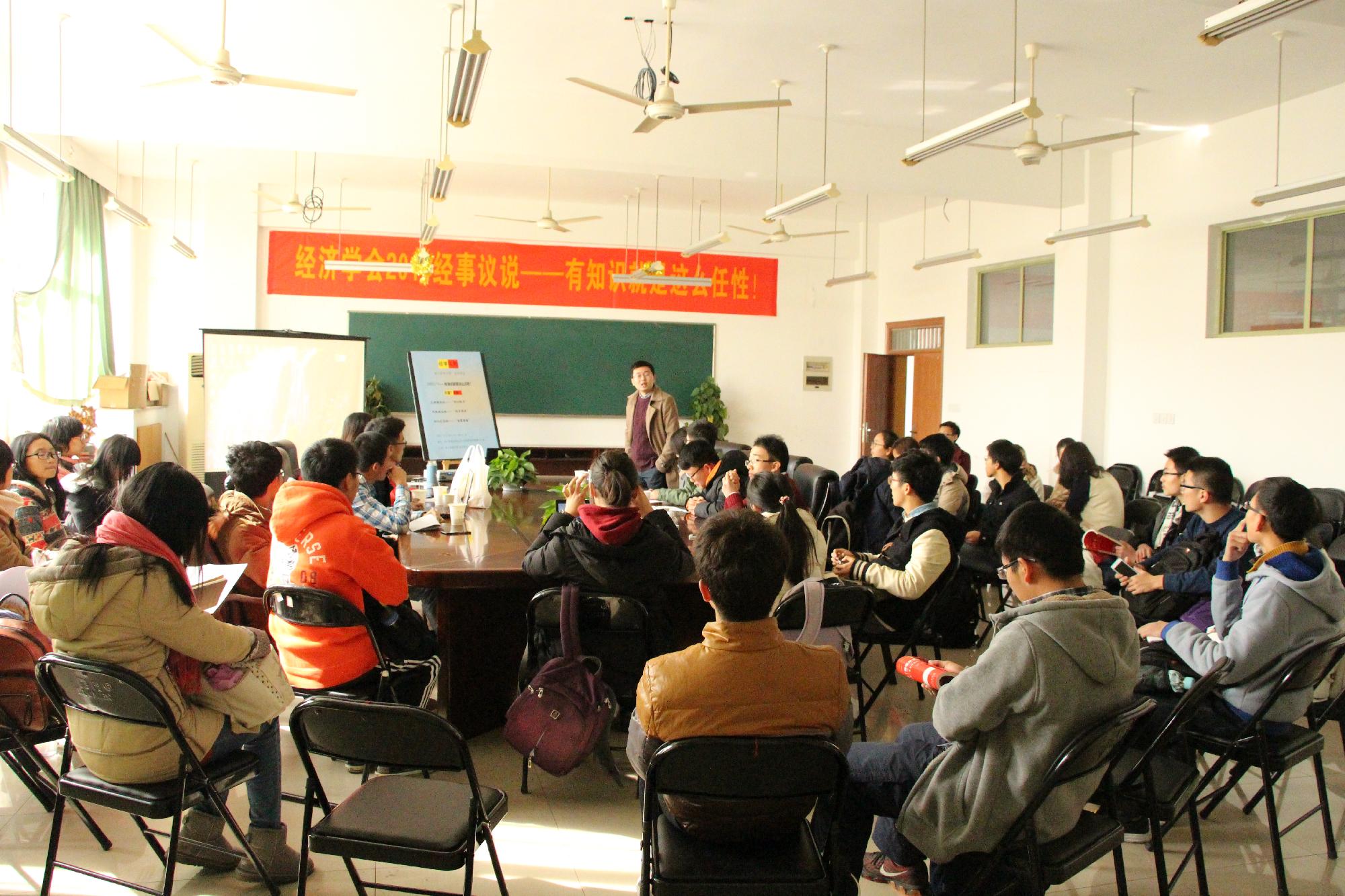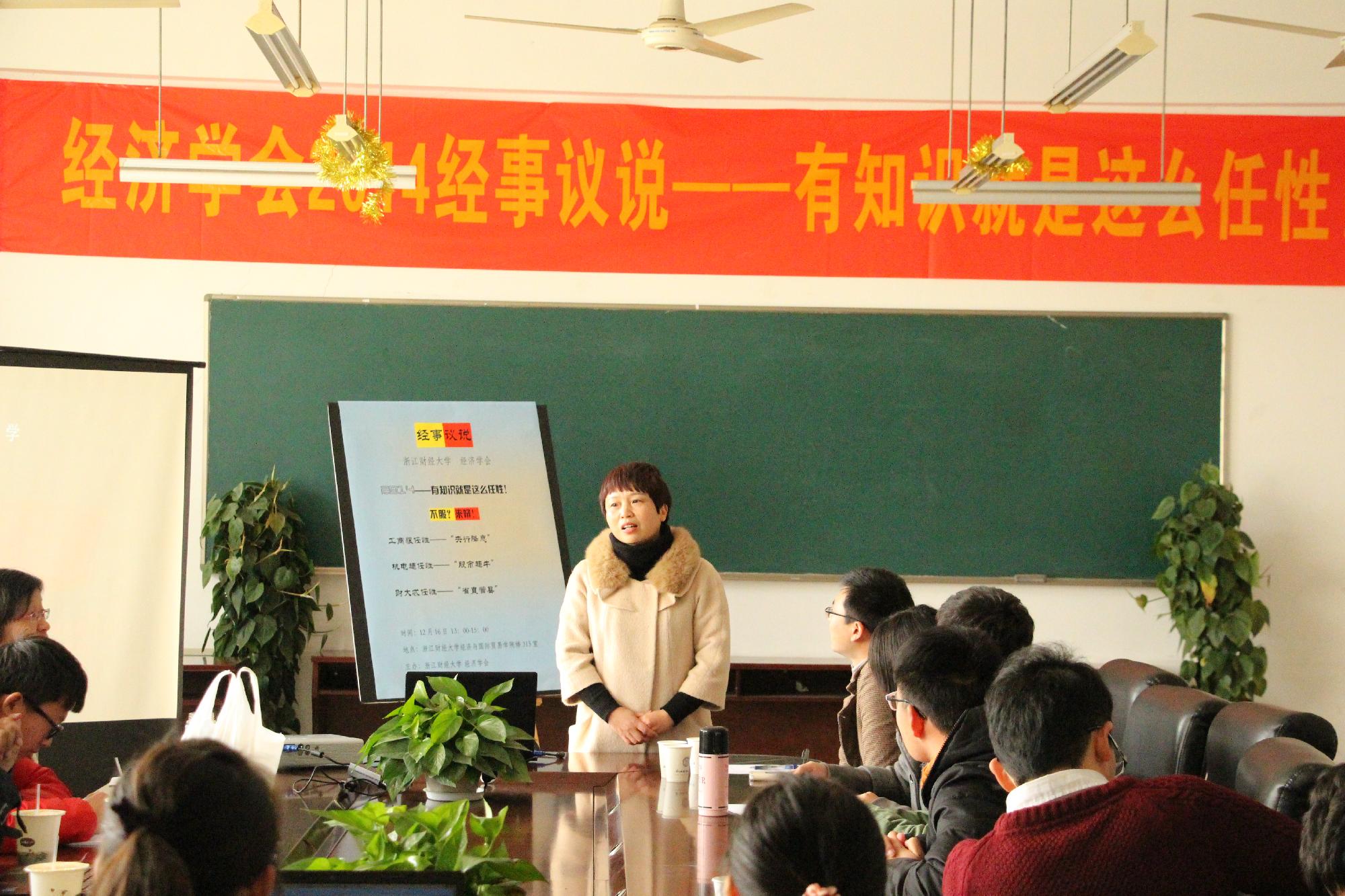 12月16日下午,由经贸学院学生经济学会主办的“2014经事议说”——经济热点问题讨论交流会活动在学院楼313会议室举行。来自杭州电子科技大学学生经济学会,浙江工商大学学生土地与房地产研究协会及我校学生经济学会成员组成的三支代表队参与了此次活动。活动邀请到杭州电子科技大学经济学会指导老师郭爱美和我校经济学会指导老师文雁兵到场指导观看。