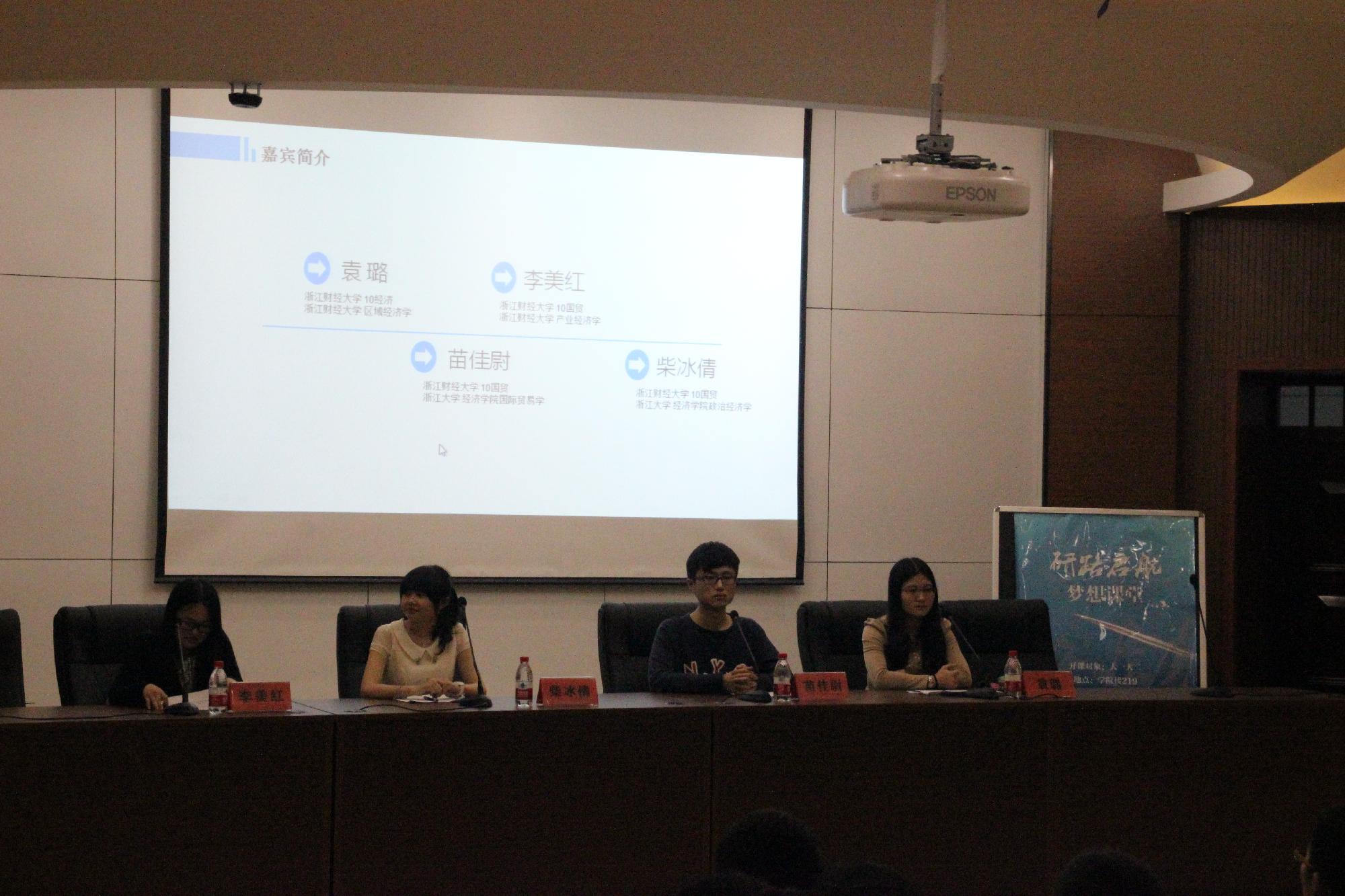 4月26日晚6:30,经贸学院“梦想课堂·研路启航”考研交流会在学院楼219顺利举行。此次请来的梦想导师有浙江大学政治经济学研究生柴冰倩(我校14届校友)、浙江大学国际贸易学专业研究生苗佳尉(我校14届校友)、我校区域经济学专业研究生袁璐及产业经济学专业研究生李美红。a漫