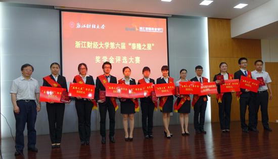 5月22日下午,我校在行政楼二楼报告厅举行第六届“泰隆之星”奖学金评选大赛。经层层展示评比,a漫 12级国贸2班陶房钰在22位候选人中脱颖而出,获得校第六届“泰隆之星”奖学金。钟晓敏副书记和浙江泰隆商业银行泰隆学院邓磊副院长为其颁发了奖学金和荣誉证书。