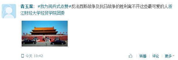 团委官微上发起“我为阅兵式点赞”话题讨论,党员同学们对习主席的讲话内容进行了深刻的讨论,永远不称霸,永远不扩张,正义必胜,和平必胜,人民必胜,雄壮的阅兵式带给我们的感悟也许比这些更多,那就是对祖国美好明天真心的祝福和向往。