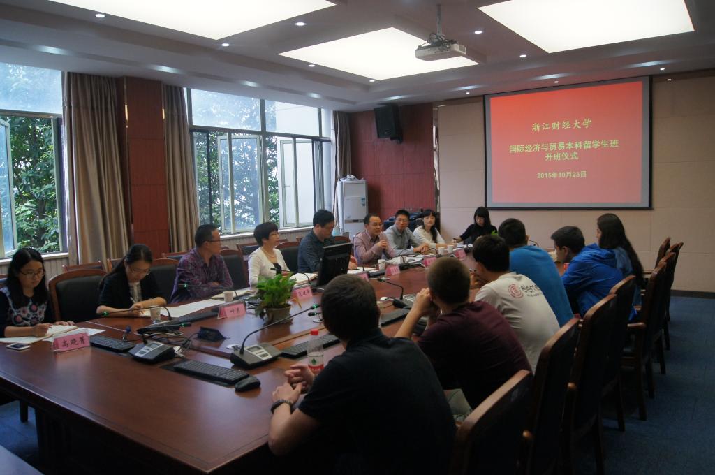 10月23日上午,我校首届国际经济与贸易专业本科留学生班开班仪式在经贸学院楼210会议室举行。国际学院副院长管春林、经贸学院院长胡亦琴、党总支书记范建锋、副院长柴志贤、副书记叶秀、国贸专业系主任茹玉骢等老师和留学生代表参加了本次开班仪式。柴志贤副院长主持。