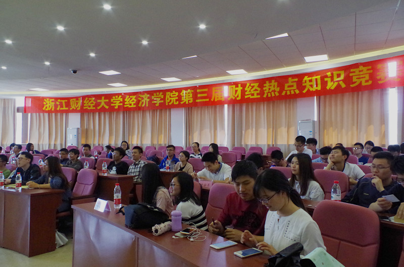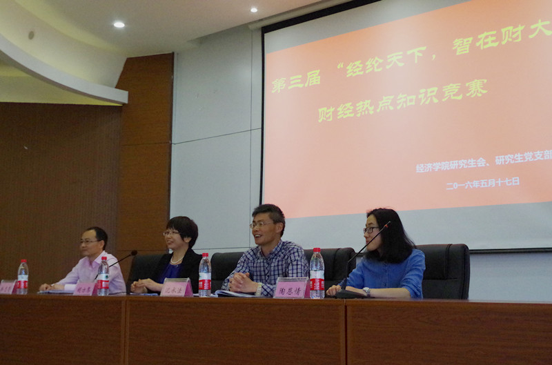 第三届“经纶天下,智在财大”财经热点知识竞赛在学院楼219报告厅隆重举行。院长胡亦琴、党总支书记沈水法、副院长柴志贤、研究生辅导员陶恩情莅临比赛现场。