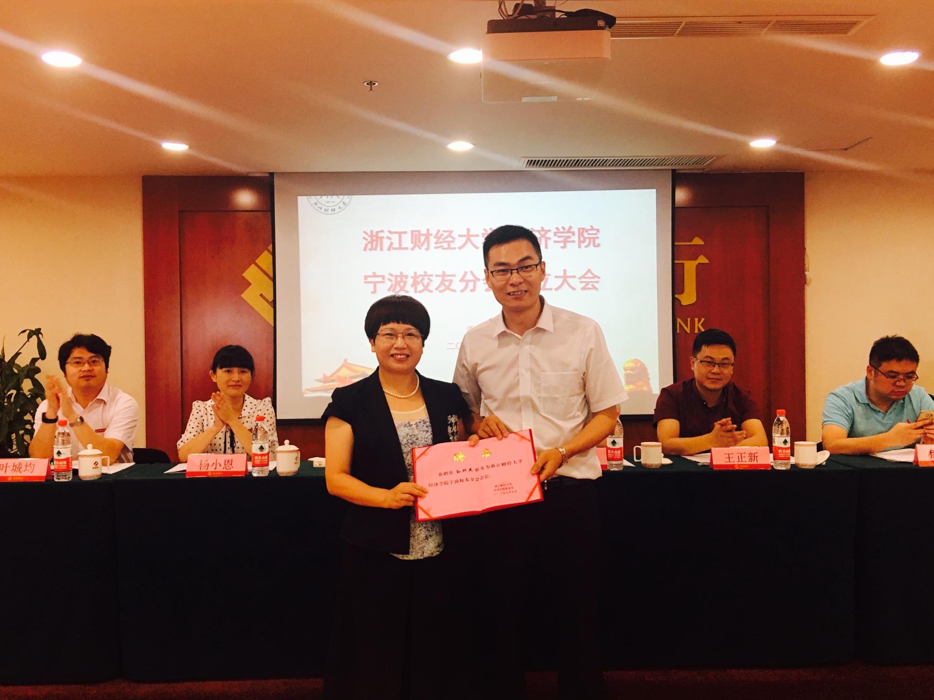 宁波校友分会章程》和首届理事会名单。院长胡亦琴为宁波校友分会会长、副会长颁发聘书,并为宁波校友分会进行授旗。宁波校友分会会长孙科杰发言,他讲述了学生时代他眼中的浙财大,表达了对母校发展的祝贺、对校园生活的眷恋、对母校的感恩和团结力量办好宁波校友分会的决心。