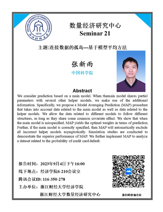 张新雨,中科院数学与系统科学研究院预测中心研究员。主要从事计量经济学和统计学的理论和应用研究工作,具体研究方向包括模型平均、机器学习和组合预测等,发表论文80余篇,其中多篇论文发表在统计学四大期刊和计量经济学顶级期刊JoE。担任SCI期刊《JSSC》领域主编和其他5个国内外重要期刊的编委,是双法学会数据科学分会副理事长、国际统计学会当选会员,先后主持自科优秀和杰出青年基金项目,曾获中国青年科技奖。