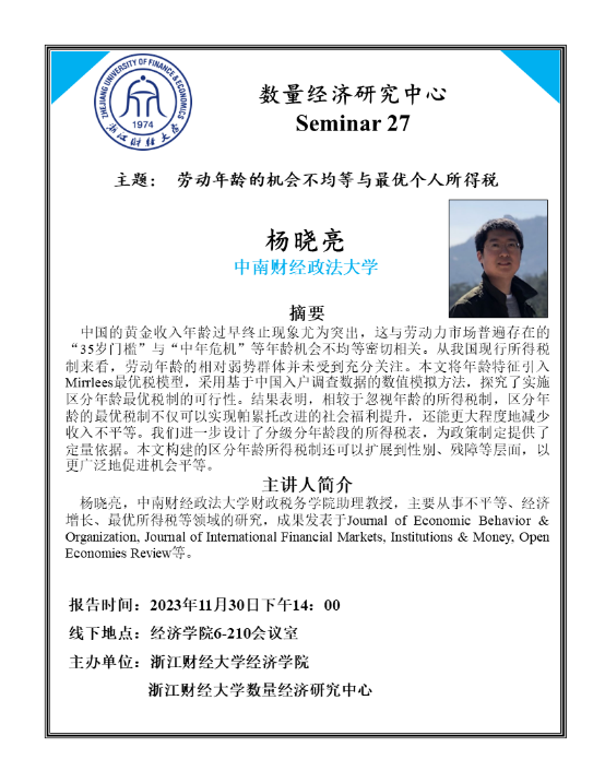 杨晓亮,中南财经政法大学财政税务学院助理教授,主要从事不平等、经济增长、最优所得税等领域的研究,成果发表于Journal of Economic Behavior & Organization, Journal of International Financial Markets, Institutions & Money, Open Economies Review等。