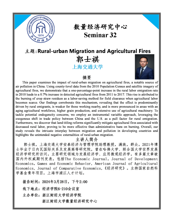 郭士祺,上海交通大学安泰经济与管理学院助理教授,满族,群众。2021年博士毕业于日内瓦国际关系及发展高等研究院,曾在哈佛大学、联合国大学世界发展经济学研究所访问。主要研究领域为发展经济学、应用微观经济学,有多篇文章被国内外权威期刊发表,包括The Economic Journal,Journal of Development Economics,Games and Economic Behavior, American Journal of Agricultural Economics, Journal of Comparative Economics,《经济研究》。主持国家自然科学基金青年项目,上海市浦江人才计划。
