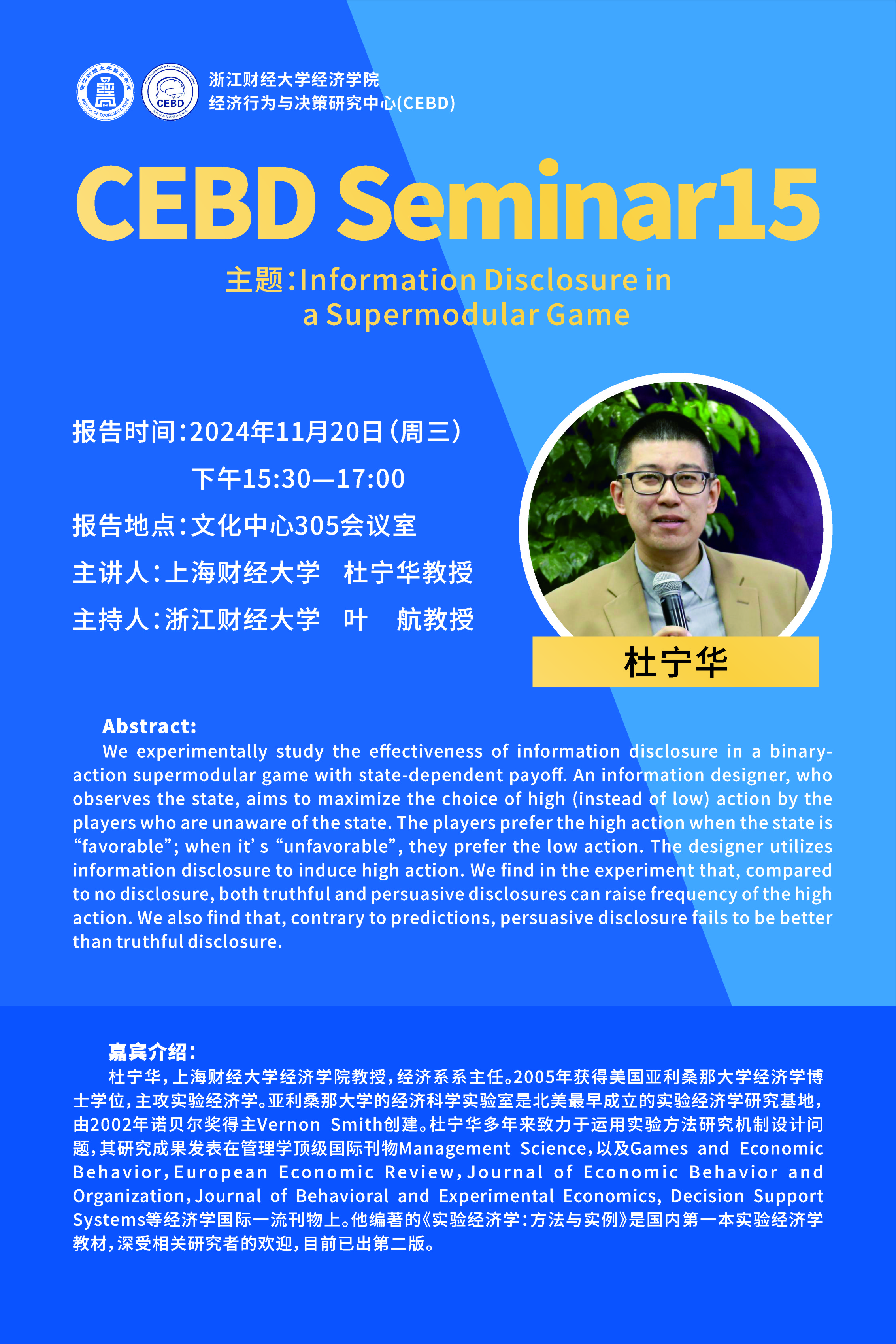 教授,经济系系主任。2005年获得美国亚利桑那大学经济学博士学位,主攻实验经济学。亚利桑那大学的经济科学实验室是北美最早成立的实验经济学研究基地,由2002年诺贝尔奖得主Vernon Smith创建。杜宁华多年来致力于运用实验方法研究机制设计问题,其研究成果发表在管理学顶级国际刊物Management Science,以及Games and Economic Behavior,European Economic Review,Journal of Economic Behavior and Organization,Journal of Behavioral and Experimental Economics, Decision Support Systems等经济学国际一流刊物上。他编著的《实验经济学:方法与实例》是国内第一本实验经济学教材,深受相关研究者的欢迎,目前已出第二版。