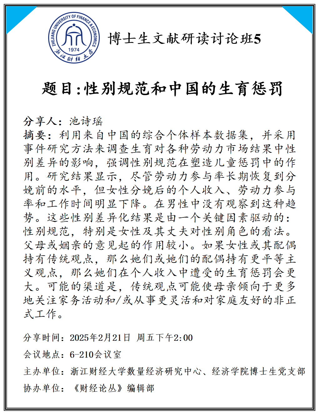 内容摘要:利用来自中国的综合个体样本数据集,并采用事件研究方法来调查生育对各种劳动力市场结果中性别差异的影响,强调性别规范在塑造儿童惩罚中的作用。研究结果显示,尽管劳动力参与率长期恢复到分娩前的水平,但女性分娩后的个人收入、劳动力参与率和工作时间明显下降。在男性中没有观察到这种趋势。这些性别差异化结果是由一个关键因素驱动的:性别规范,特别是女性及其丈夫对性别角色的看法。父母或姻亲的意见起的作用较小。如果女性或其配偶持有传统观点,那么她们或她们的配偶持有更平等主义观点,那么她们在个人收入中遭受的生育惩罚会更大。可能的渠道是,传统观点可能使母亲倾向于更多地关注家务活动和/或从事更灵活和对家庭友好的非正式工作。