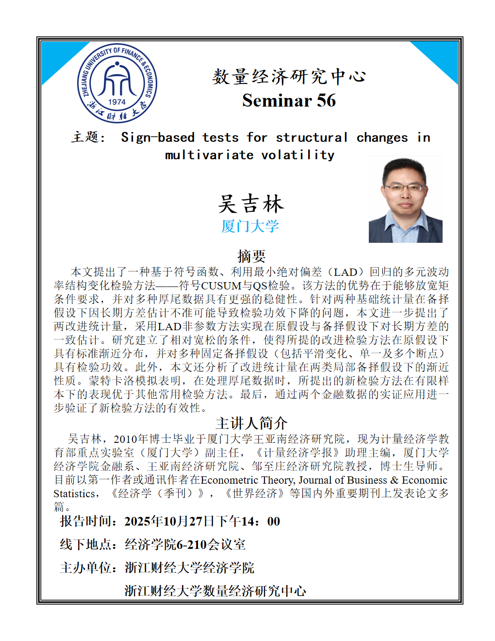 嘉宾介绍:吴吉林。男,浙江安吉人,中国民建党党员, 2010年博士毕业于厦门大学王亚南经济研究院,现为计量经济学教育部重点实验室(厦门大学)副主任,《计量经济学报》助理主编,厦门大学a漫