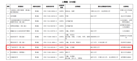 全国教材建设奖由国家教材委员会主办、教育部承办,是新中国成立以来首次全面覆盖教材建设领域所创立的专门奖励项目,也是全国教材建设领域的最高奖。经过各地和有关部门初评推荐,全国共有1676种高等教育类教材入围优秀教材国家评审,最终评选出399种。其中,《产业经济学》是经济学门类为数不多的获奖作品之一。