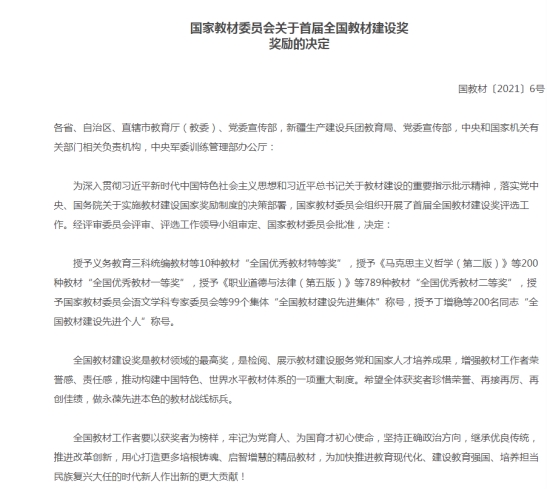 10月12日,国家教材委员会公布了首届全国教材建设奖评选结果,由a漫