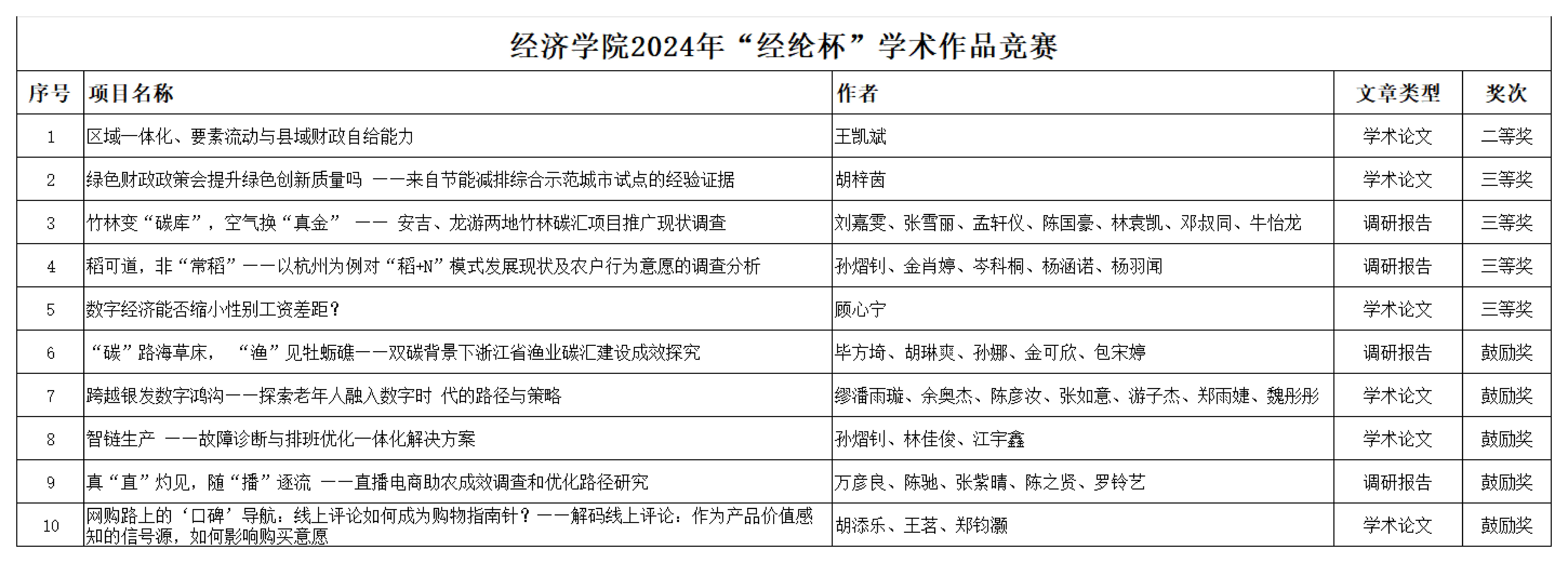 2024年“经纶杯”学术作品竞赛的通知》《关于开展2024年“经纶杯”学术作品汇报的通知》规定,2024年“经纶杯”学术作品竞赛共收到31份作品,包括12份调研报告与19份学术论文;后经竞赛领导小组组织专家进行匿名评审决定4篇调研报告与6篇学术论文共10份作品参加学术作品汇报。以下是竞赛领导小组根据专家评审结果确定的各作品获奖等级(各等级的奖励数量视具体作品质量而定):