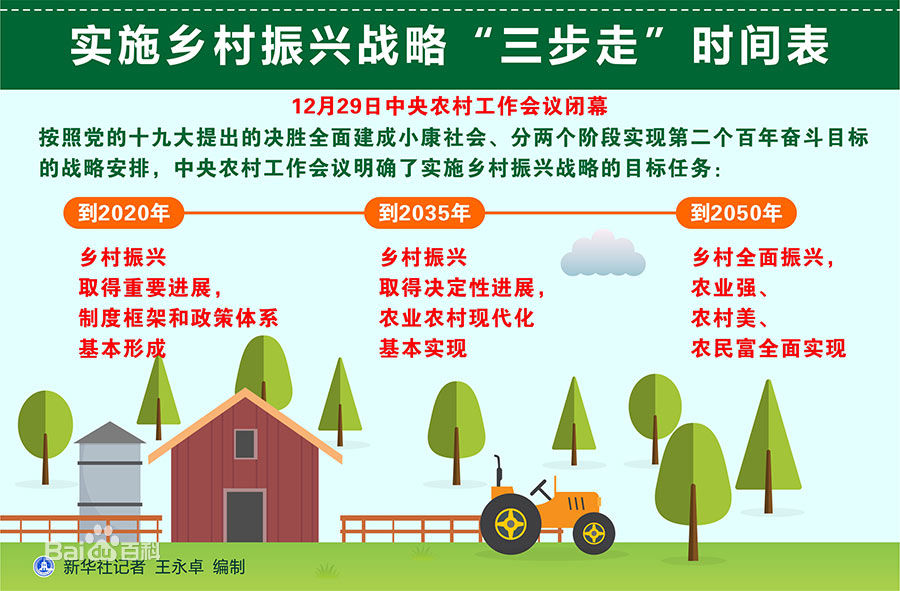 农业在国民经济中处于基础地位,农民是最值得关怀的最大群体,农村是全面建成小康社会的最大短板。习近平同志2017年10月18日在党的十九大报告中提出实施乡村振兴战略。2017年12月29日,中央农村工作会议首次提出走中国特色社会主义乡村振兴道路,让农业成为有奔头的产业,让农民成为有吸引力的职业,让农村成为安居乐业的美丽家园。2018年2月4日,中央公布了2018年中央一号文件,即《中共中央国务院关于实施乡村振兴战略的意见》。2018年3月5日,国务院总理李克强在作政府工作报告时说,大力实施乡村振兴战略。按照党的十九大提出的决胜全面建成小康社会、分两个阶段实现第二个百年奋斗目标的战略安排,中央农村工作会议明确了实施乡村振兴战略的目标任务,实施乡村振兴战略时间表: