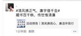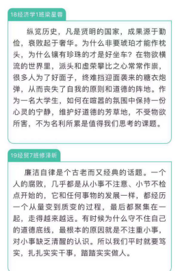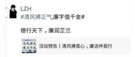 学院组织开展“清风拂我心,廉洁伴我行”活动,鼓励学生将清正廉洁的态度亮出来,积极分享有关廉洁的古文古诗,并结合当代大学生的使命担当,撰写心得感想。活动开展以来,共收到感想400余份,并将“崇德向上、廉洁自律”的文化根植到校园中,不断营造风清气正的环境。