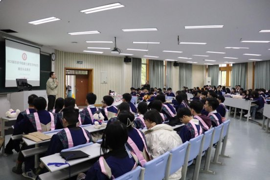 党委副书记、纪委书记崔泰铭为硕士毕业生们讲授廉洁从业第一课,全体硕士毕业生参会。