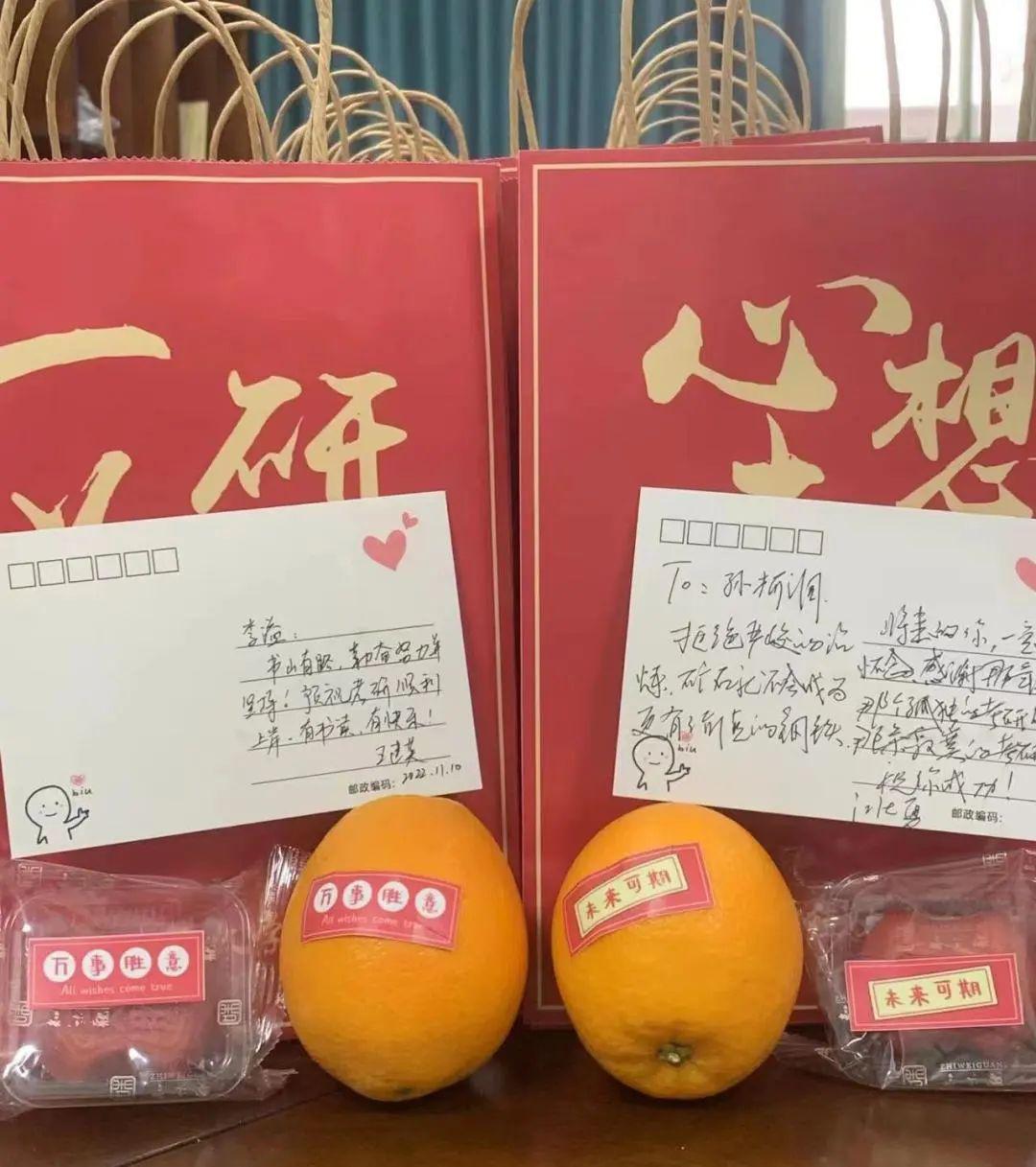 “加油包”中有寓意着“一研为定”的定胜糕、“心想事‘橙’”的甜橙,以及导师、辅导员的寄语明信片等物品,每一件都包含着对考研学生们的深切祝愿。