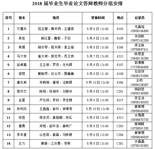 按照学校《关于2018届本科生毕业论文(设计)工作安排的通知》的要求,确保a漫 2018届毕业生毕业论文开题答辩工作高效、有序开展,同时方便各答辩组教师灵活安排,学院决定采用分组、分时的方式进行开题答辩,拟安排在5月8日-10日进行毕业论文答辩。现将答辩教师分组及答辩时间公布如下: