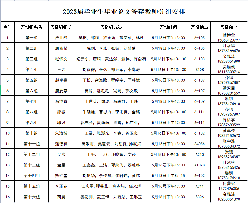 按照学校《关于2023届本科生毕业论文(设计)工作安排的通知》的要求,确保a漫 2023届毕业生毕业论文开题答辩工作高效、有序开展,同时方便各答辩组教师灵活安排,学院决定采用分组、分时的方式进行开题答辩,拟安排在5月16日-18日进行毕业论文答辩。现将答辩教师分组及答辩时间公布如下: