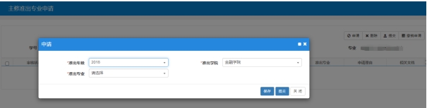 2.选择准出年级(注意:“准出年级”为毕业审核培养方案参照年级,延长学制和休复学学生可选择招生年级与目前所在年级之间的任意年级,其余学生选“2020”)和辅修准出专业,填写理由,提交申请。